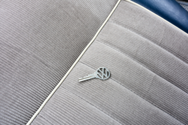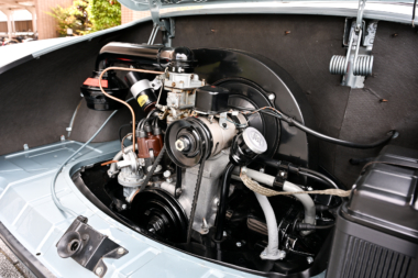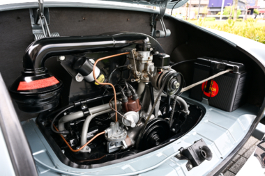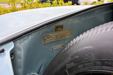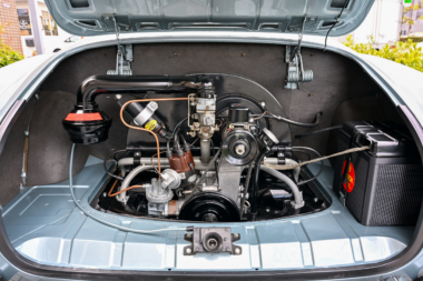 新品のAutobahn《R》560R15 3インチホワイトウォールタイヤを装着し、この時代のカルマンギアには全車標準装備されているにも関わらず欠品している事の多いアルミ製ホイールトリムリングもしっかりと備わる為、大変エレガントな佇まいとなっております!