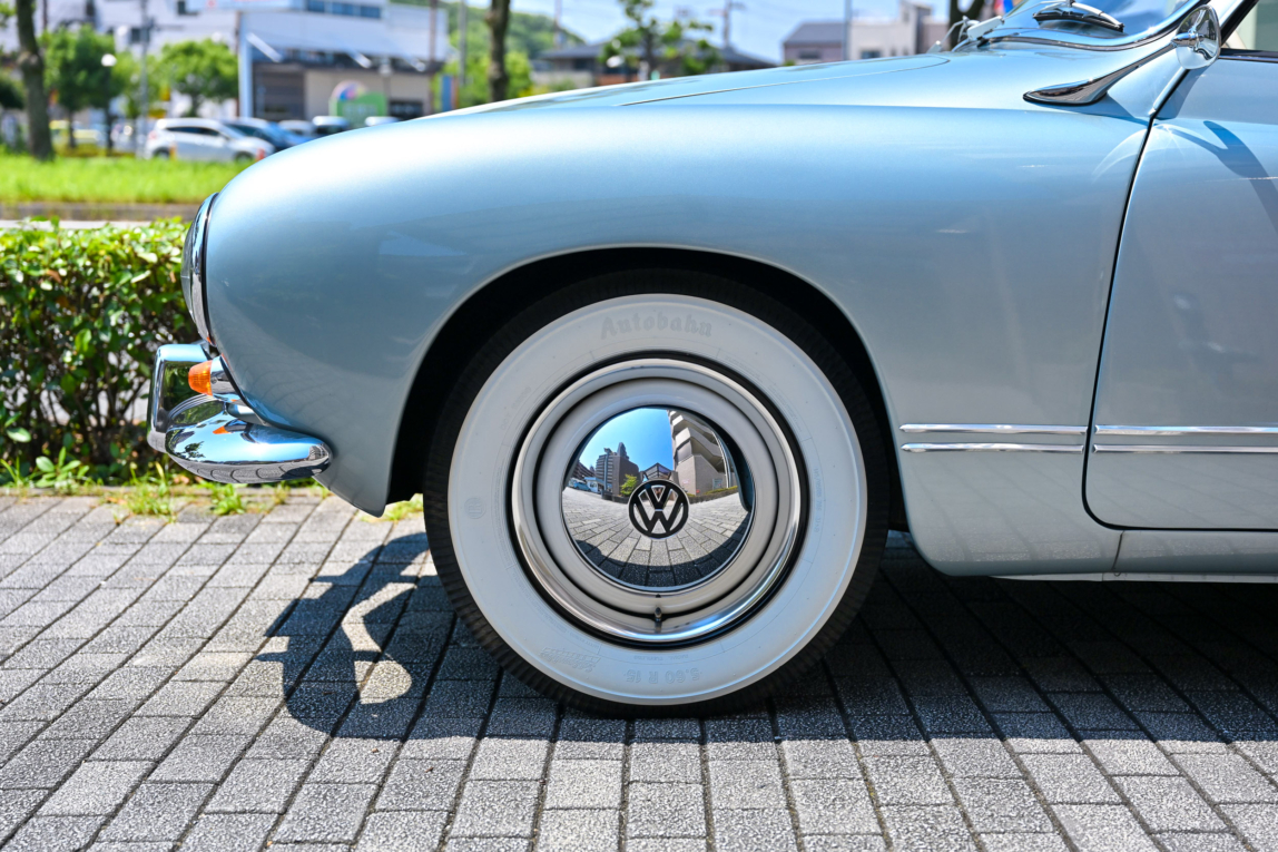 新品のAutobahn《R》560R15 3インチホワイトウォールタイヤを装着し、この時代のカルマンギアには全車標準装備されているにも関わらず欠品している事の多いアルミ製ホイールトリムリングもしっかりと備わる為、大変エレガントな佇まいとなっております!